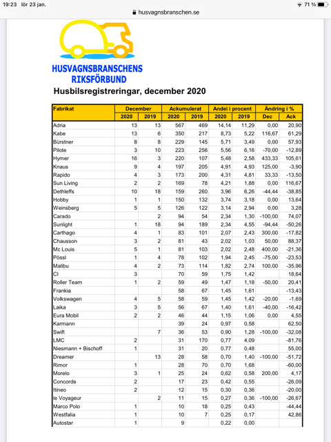Hymer visar också en exceptionell ökning, från att 2019 registrerat 107 bilar, till att 2020 uppvisa 220 bilar, en ökning med 105,61%. Däremot har det gått sämre för SunLight som tappade 50% av sin försäljning, från att ha sålt 189 bilar 2019 blev det bara 94 bilar förra året. Än värre öde drabbade LMC som 2019 registrerade 170 nya LMC- bilar på den svenska marknaden, för att förra året redovisa endast 30 nya bilar, LMC backade med hela 81,76%.