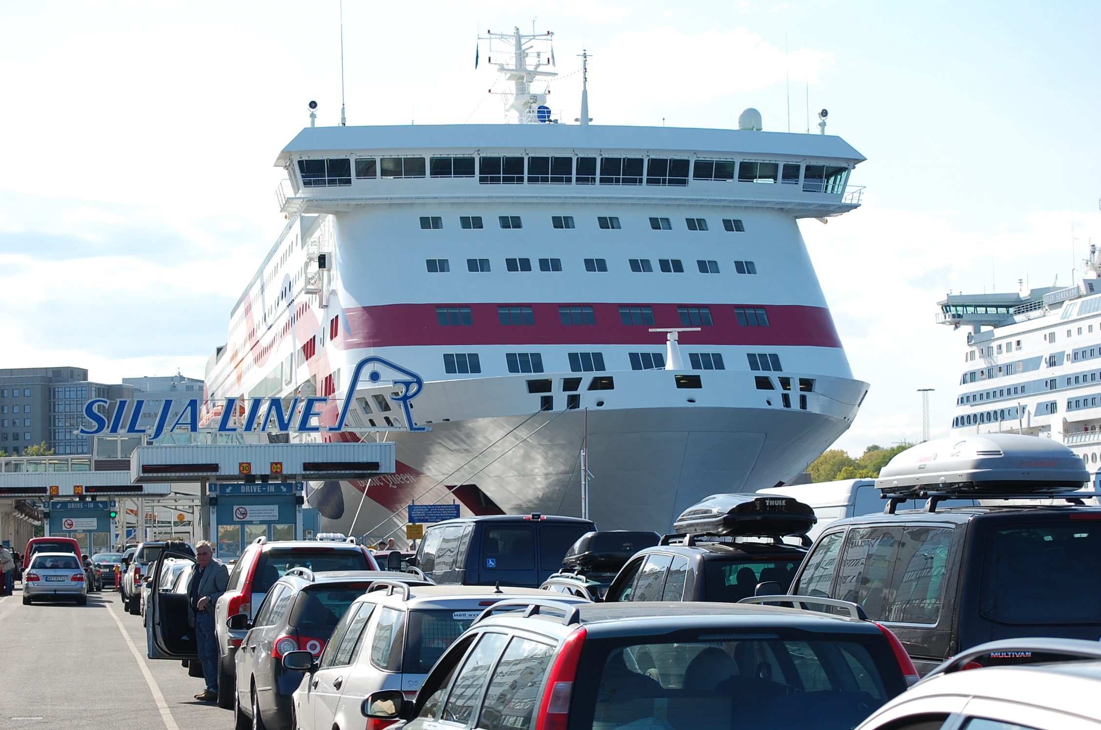 Efter en god natts sömn och stor frukost närmade vi oss Tallinn. Högtalaren skallade ”Om 10 minuter ankommer.…”, rusade ner till bilen på bildäck. Beredda. Såg hur rad efter rad åkte ur färjan, så blev det vår tur. Tur? Motorn igång, ettan i, handbromsen släppt, gasar, men ingenting händer! Bilen rör sig inte! Min tanke var att alla bromsar under natten hade rostat fast i den fuktiga miljö som det är i båtar. Här var vi för att stanna. Min fru som är yngre, slankare och framför allt snabbare, kastar sig ur bilen, sticker sedan upp huvudet och säger helt lugnt, ”klossar bakom hjulen”. Klossar!