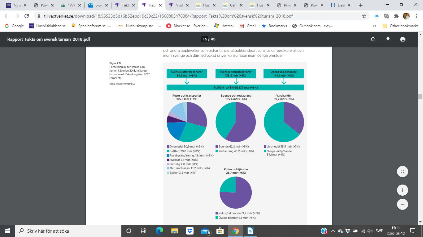- 33% Boende och restaurang. Enligt SCB´s statistik så representerar vi 25% av campingens 7 mdr och sedan äter vi en del på restauranger, men vi kommer troligen bara upp i 3% av de 105 mdr som turismen omsatte på boende och restauranger.