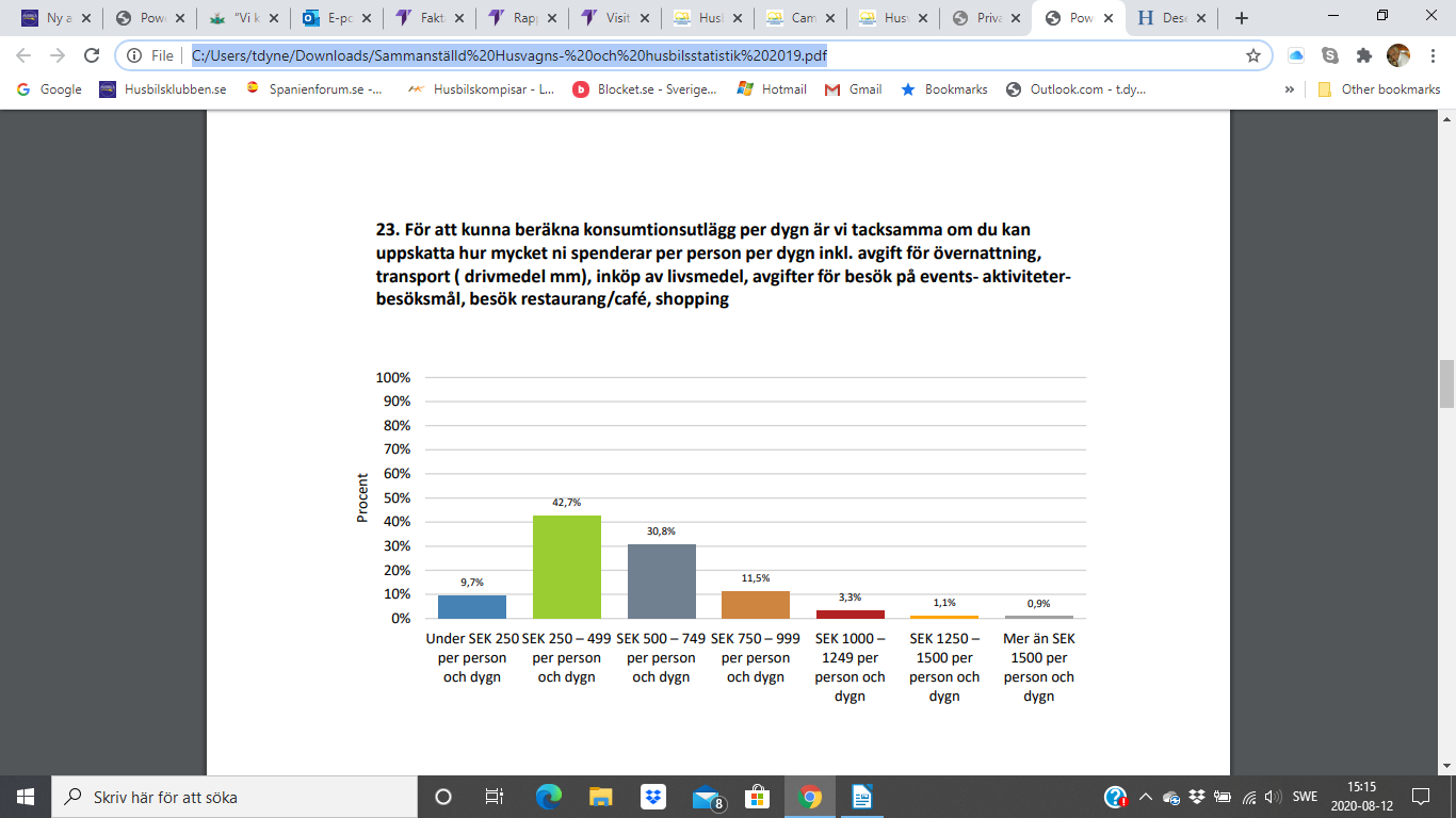 Har ingen färsk undersökning som gäller specifikt husbilsresenären från Tillväxtverket, däremot gjorde Turistrådet i Västsverige en undersökning 2019 som gav följande resultat;