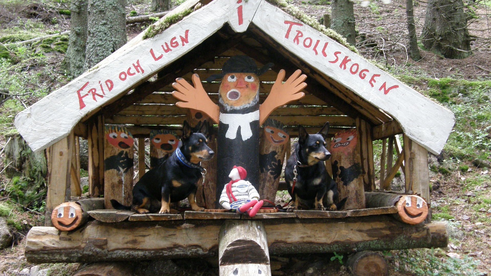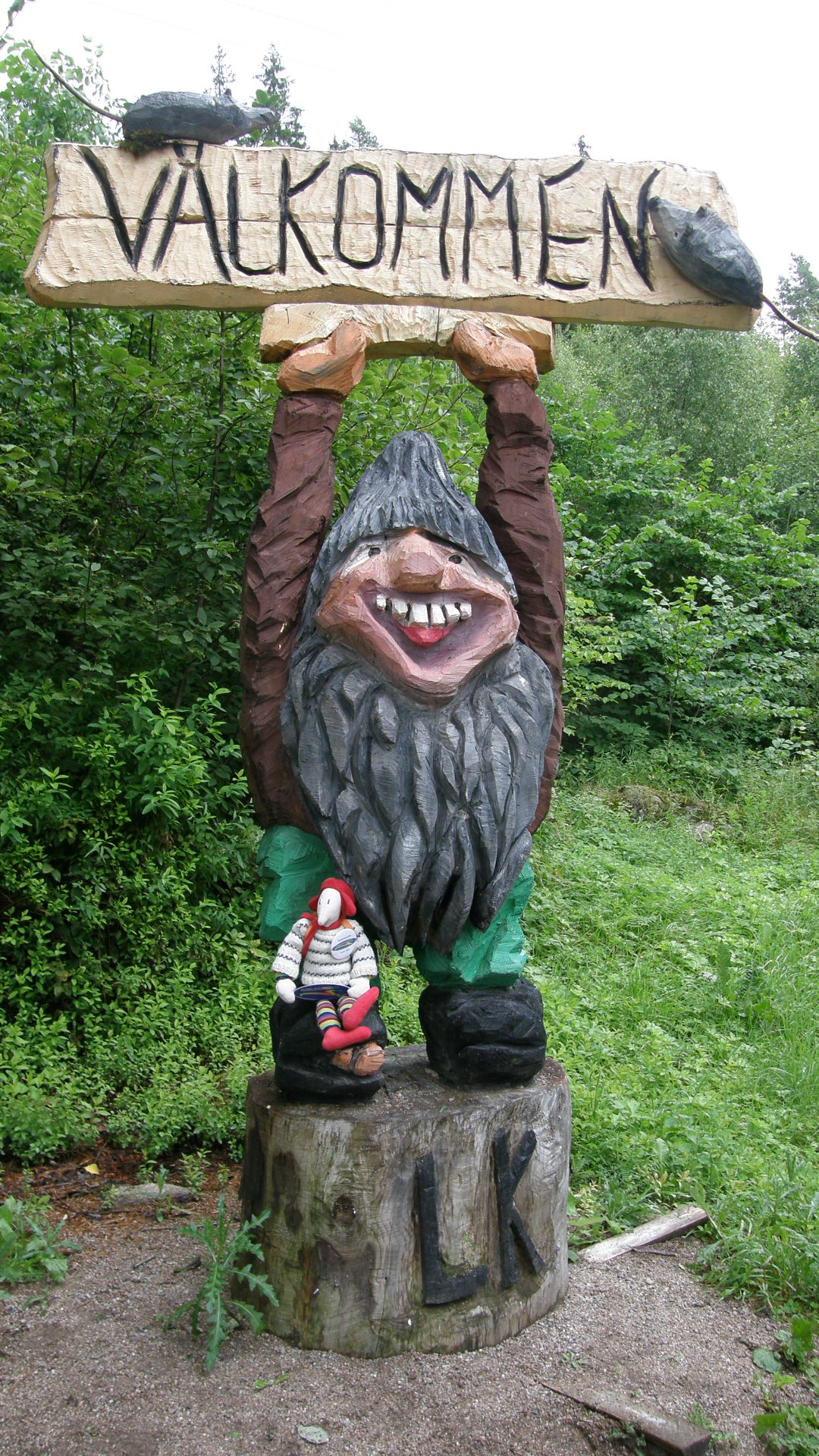 Sen åkte vi till ett ställe som heter Lesjöfors, där parkerade vi vid ett bruksmuseum där det fanns jättestora gamla rostiga maskiner. Där fanns också en stig som heter Trollstigen, det var superkul att gå där för där fanns det massor med troll, men dom var snälla. Åke och Wania letade efter en sån där cache igen, sen blev det jubel för dom var visst först med att hitta den. Sen gick vi tillbaka till muséet och letade efter en cache till, Åke klättrade högt upp på en stor rostig maskin och hittade en liten burk.