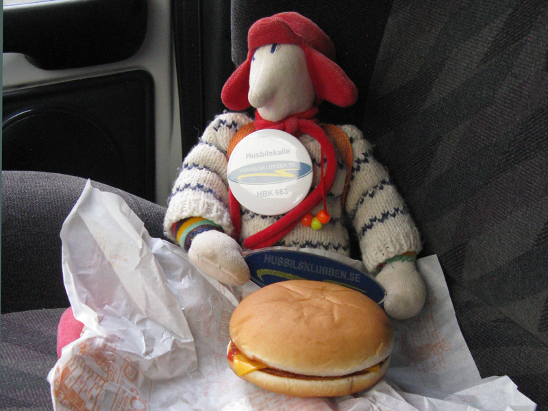 Stanna, skrek jag plötsligt. McDonalds! Jappe gick in och hämtade en ostburgare för 1 Euro! Den var god för det var mycket lök och tomat i den.