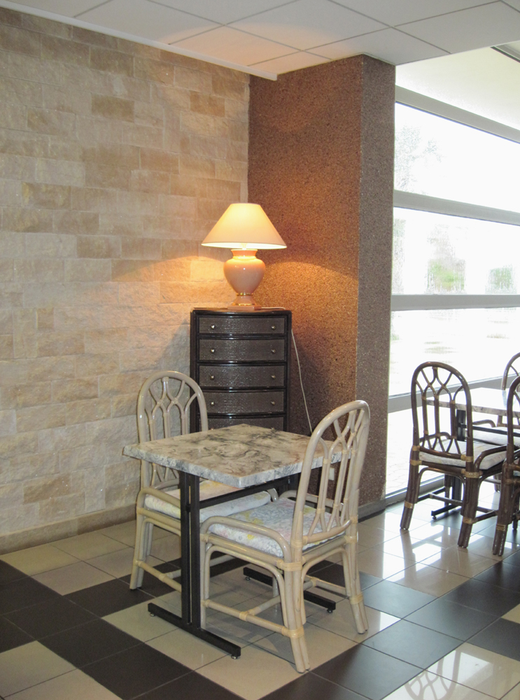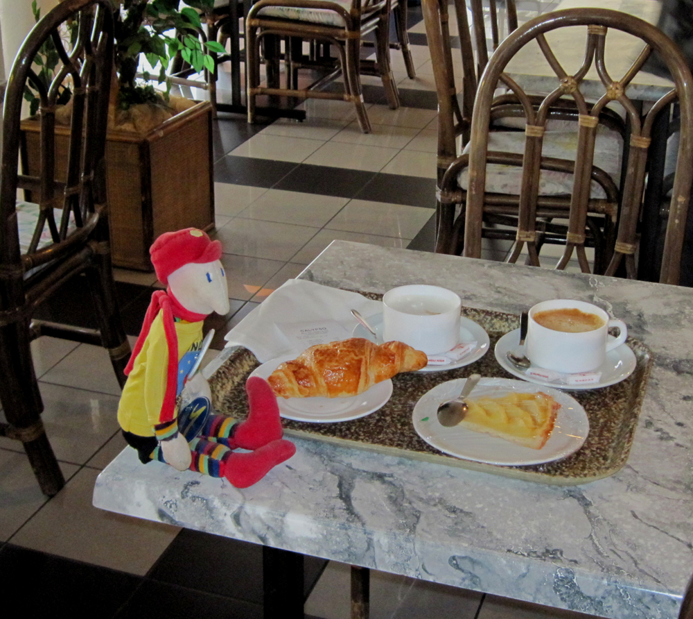 Vi åkte vidare och vid middagstiden blev vi kaffesugna. Vi trotsade vädrets makter och stannade vid Cafeteria Calypso i Aire de La Palme som var ett elegant ställe med jättegott kaffe, för att inte tala om kakan!
