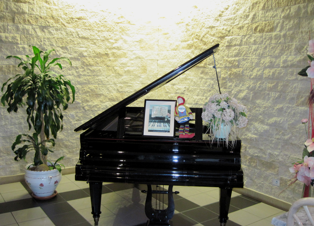 Hon gick runt och letade efter mig trots att hon hellre skulle ha velat fingra på den stora flygeln i hörnan ...