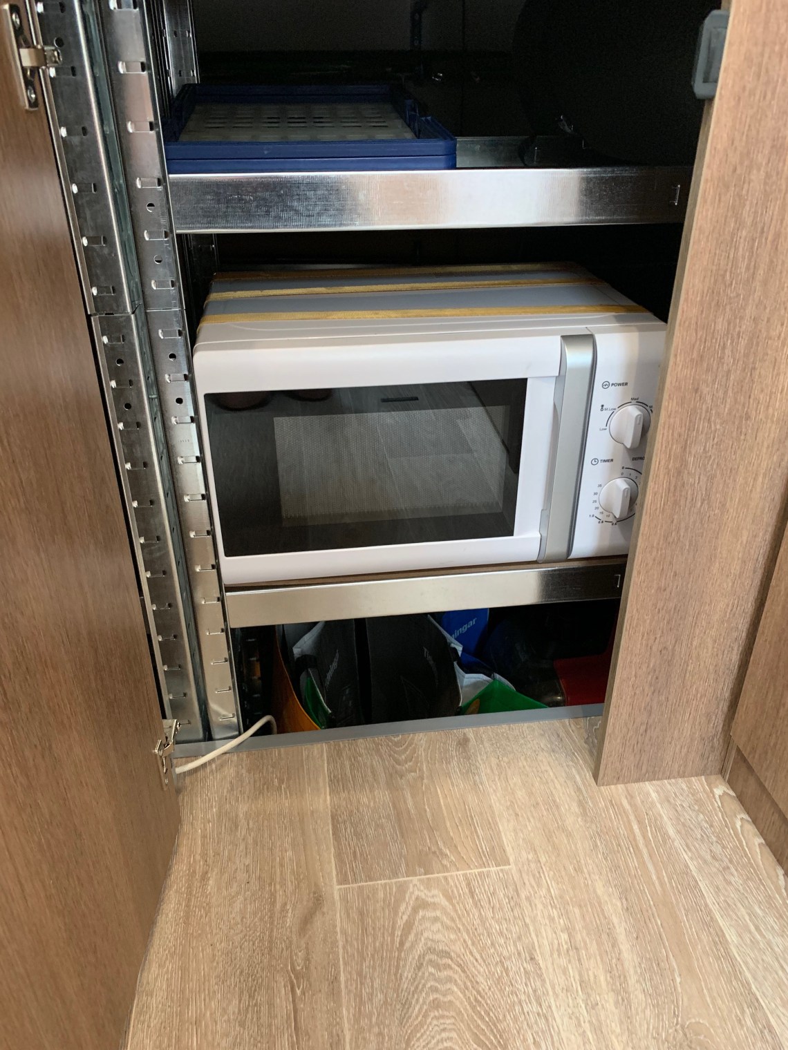 Vi fortsätter att inreda garaget så det ska passa oss när vi använder husbilen. Därför blev det idag inköp av en ytterligare en hyllsektion så att mikrovågsugnen kan placeras i garaget då vi inte vill ta bort något utrymme i köksdelen eller i garderoberna. Visst kan man tycka att två garderober är mycket och att en mikro inte tar så stor plats men eftersom vi använder husbilen även på vintern, då garderoberna verkligen behövs för tjocka vinterjackor och en del skidkläder så fick mikron alltså sin plats i garaget. Vår husbil är utrustad med en dörr/lucka som gör att man kommer åt garaget och därmed mikrovågsugnen från bodelen och den här lösningen passar oss perfekt!