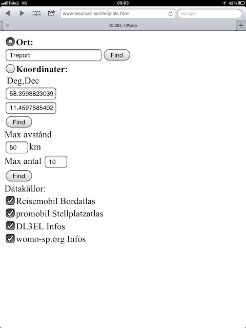 Mata in Ställplatser för husbil "http://www.bissman.se/stellplatz.html" där du kan välja de automatiskt hämtade koordinaterna eller en inmatad ort (glöm inte att bocka för).
